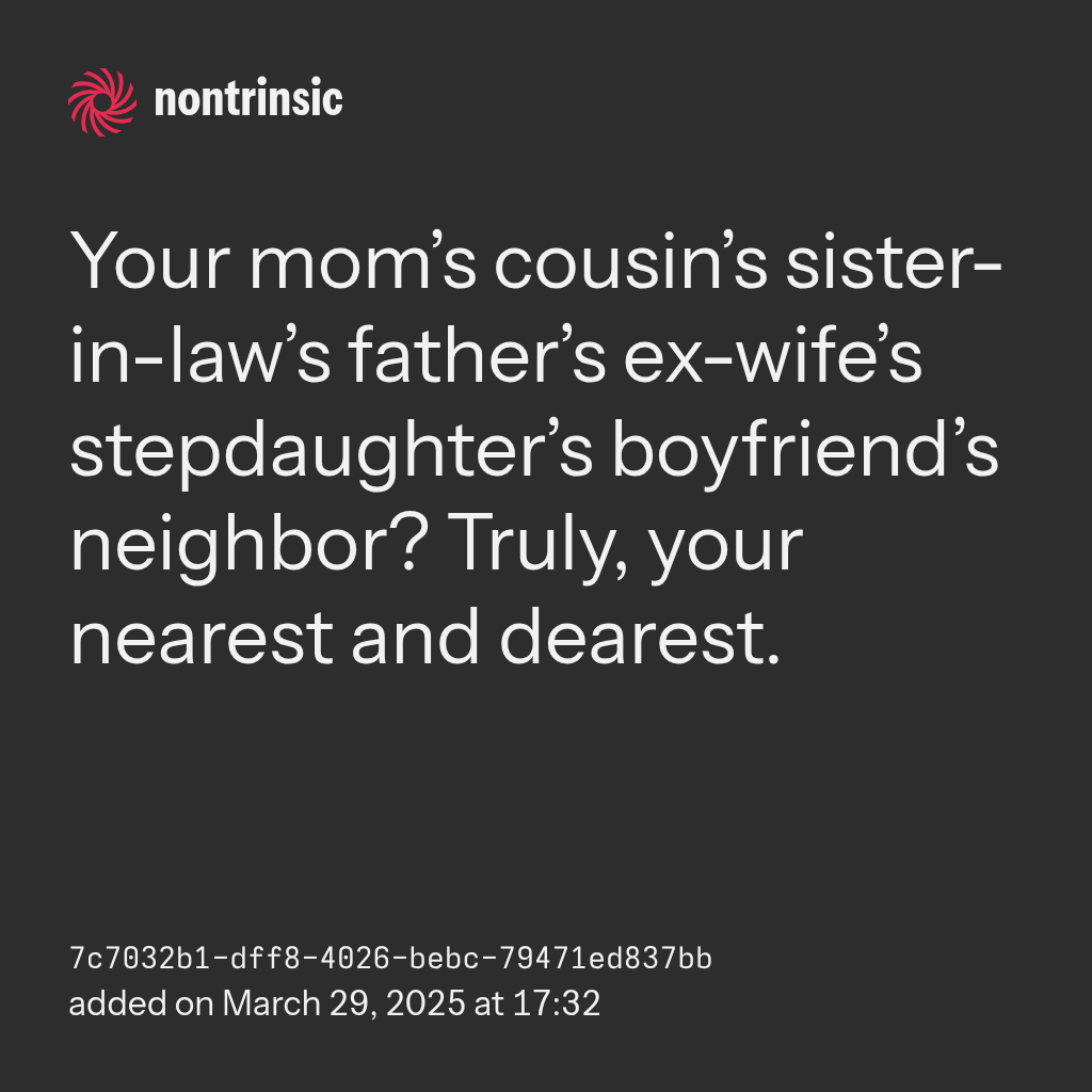 bagikanYour mom’s cousin’s sister-in-law’s father’s ex-wife’s stepdaughter’s boyfriend’s neighbor? Truly, your nearest and dearest.