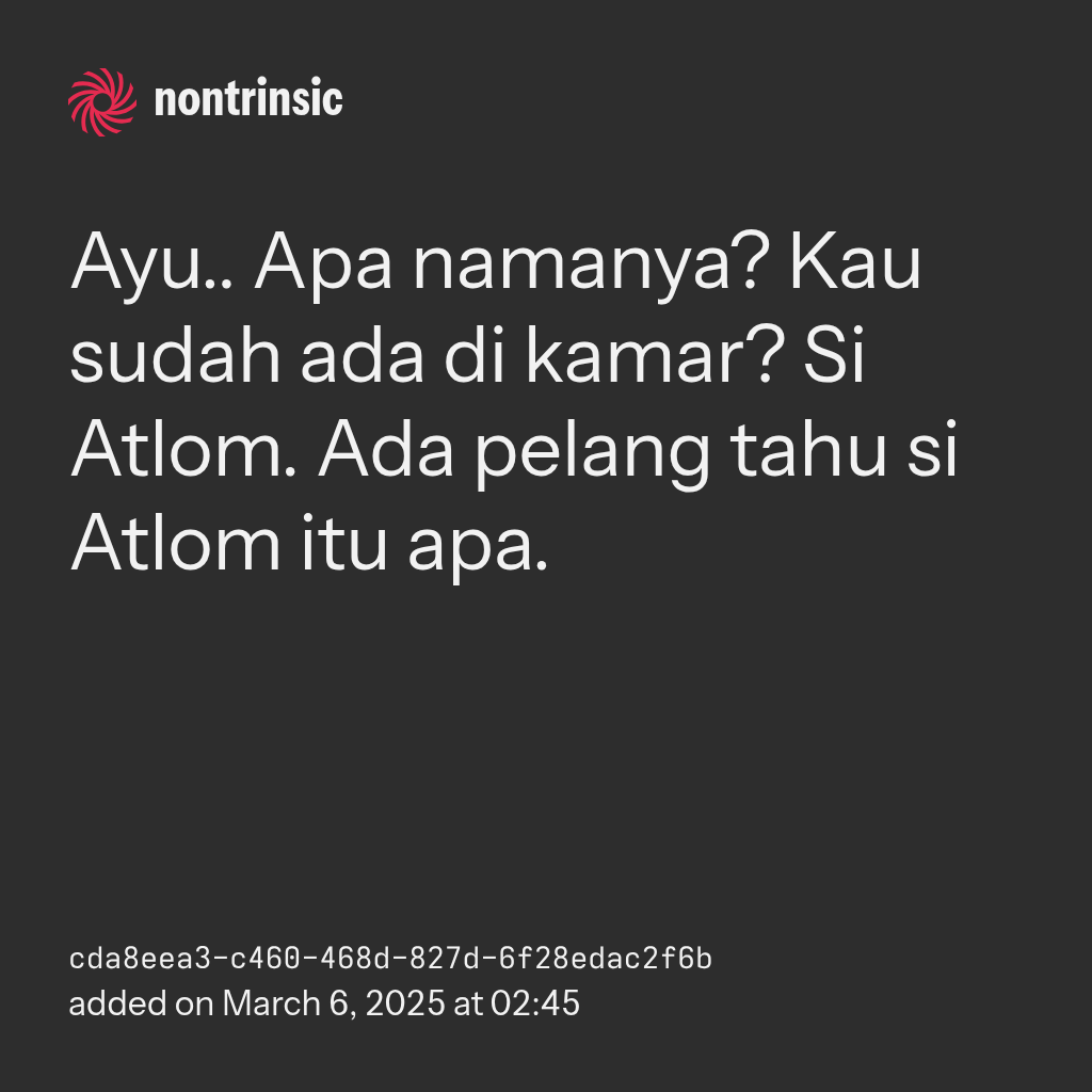 bagikanAyu.. Apa namanya? Kau sudah ada di kamar? Si Atlom. Ada pelang tahu si Atlom itu apa.