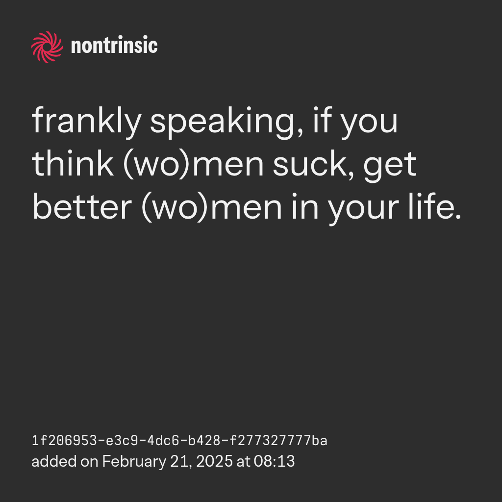 bagikanfrankly speaking, if you think (wo)men suck, get better (wo)men in your life.