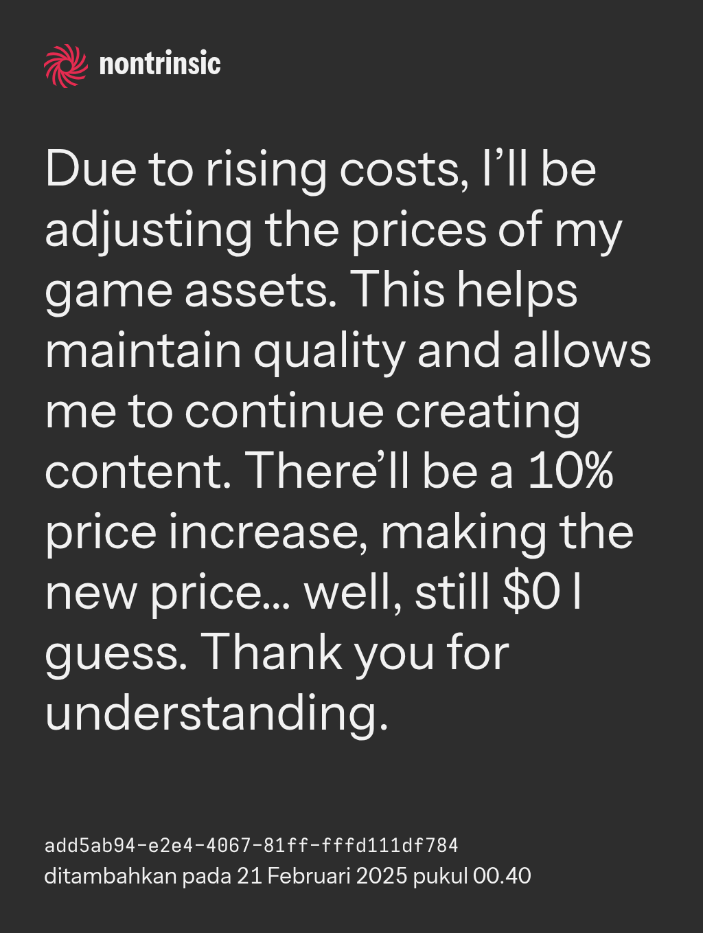 bagikanDue to rising costs, I’ll be adjusting the prices of my game assets. This helps maintain quality and allows me to continue creating content. There’ll be a 10% price increase, making the new price… well, still $0 I guess. Thank you for understanding.