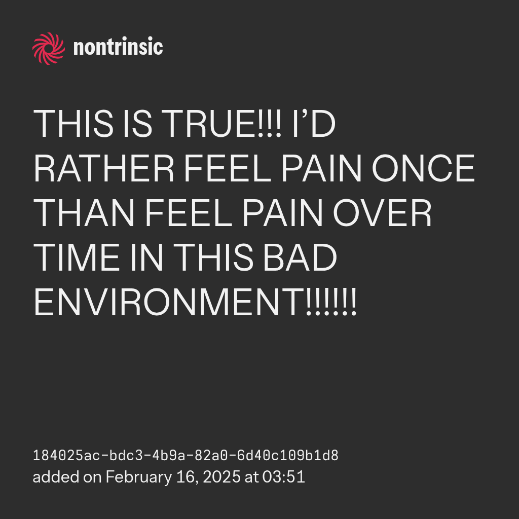 bagikanTHIS IS TRUE!!! I’D RATHER FEEL PAIN ONCE THAN FEEL PAIN OVER TIME IN THIS BAD ENVIRONMENT!!!!!!