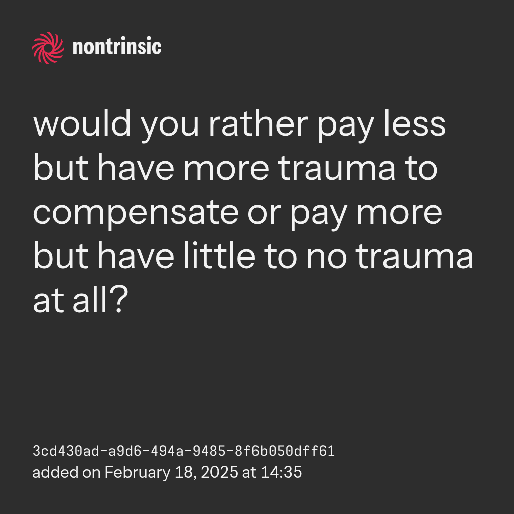 bagikanwould you rather pay less but have more trauma to compensate or pay more but have little to no trauma at all?