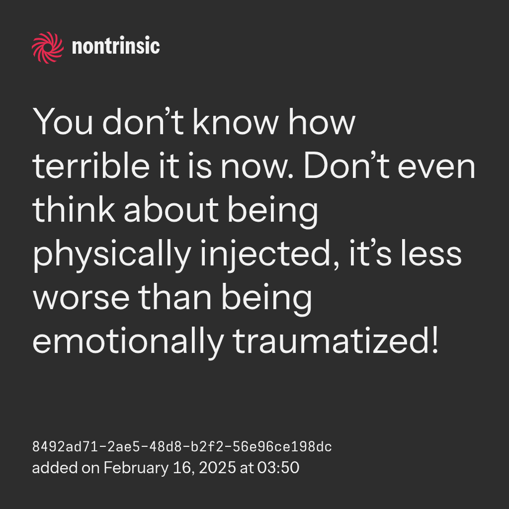 bagikanYou don’t know how terrible it is now. Don’t even think about being physically injected, it’s less worse than being emotionally traumatized!