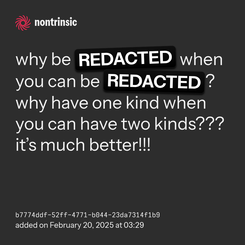 bagikanwhy be REDACTED when you can be REDACTED? why have one kind when you can have two kinds??? it’s much better!!!