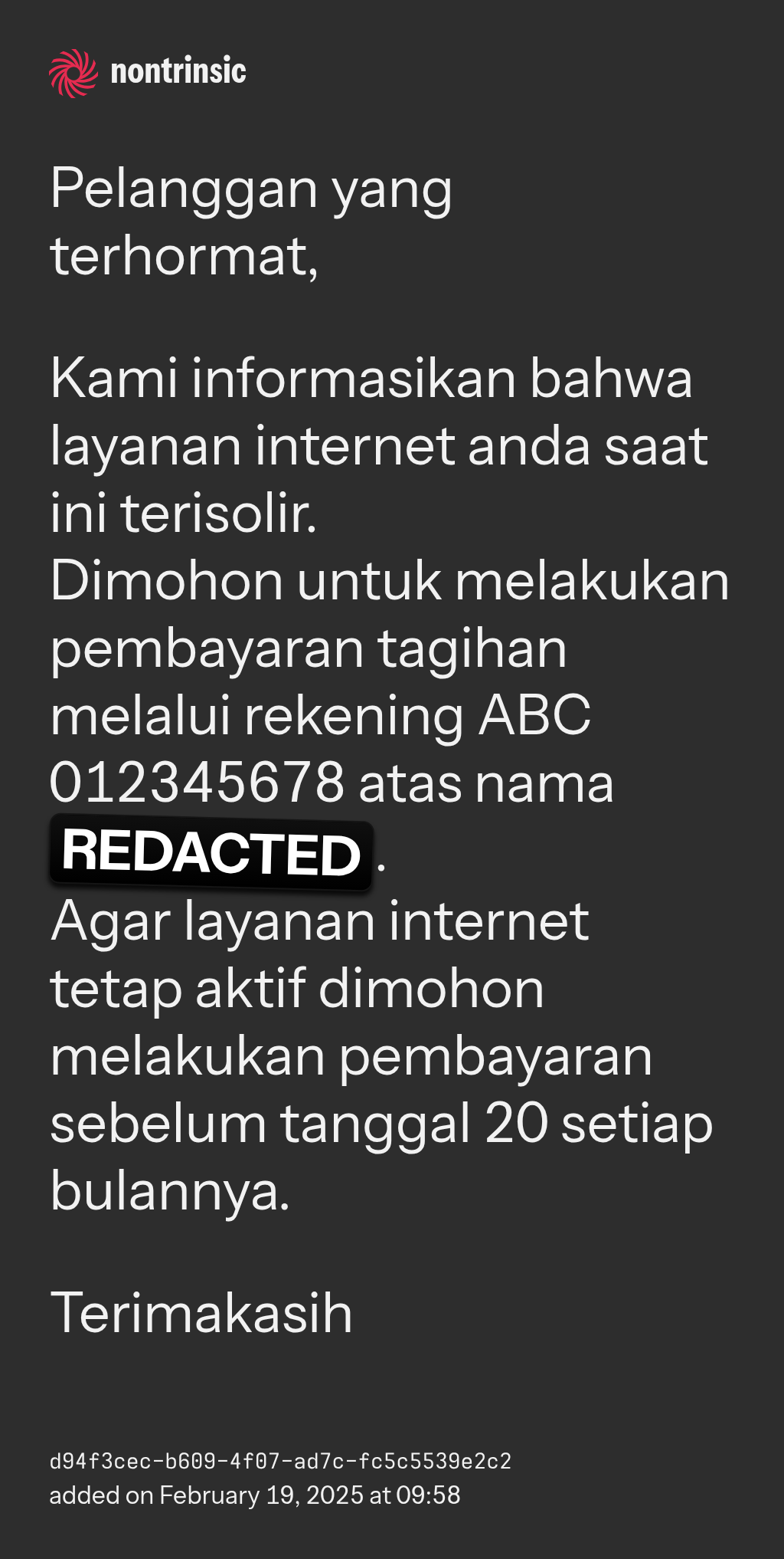 Dimohon untuk melakukan pembayaran tagihan melalui rekening ABC 012345678 atas nama REDACTED.