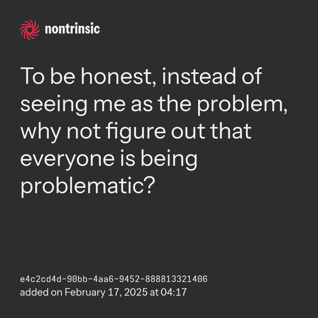 bagikanTo be honest, instead of seeing me as the problem, why not figure out that everyone is being problematic?