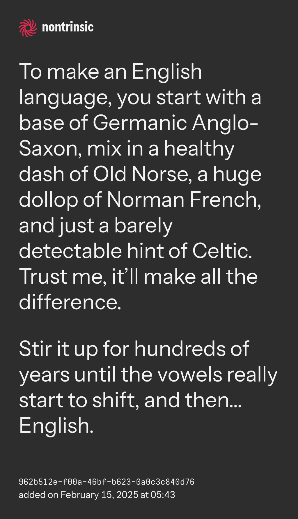 bagikanTo make an English language, you start with a base of Germanic Anglo-Saxon, mix in a healthy dash of Old Norse, a huge dollop of Norman French, and just a barely detectable hint of Celtic. Trust me, it’ll make all the difference.