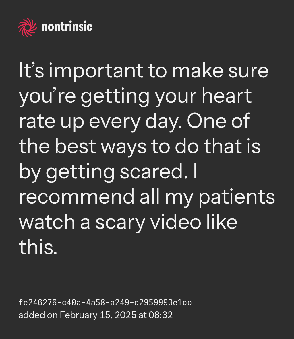 bagikanIt’s important to make sure you’re getting your heart rate up every day. One of the best ways to do that is by getting scared. I recommend all my patients watch a scary video like this.
