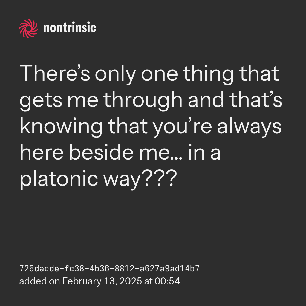 bagikanThere’s only one thing that gets me through and that’s knowing that you’re always here beside me… in a platonic way???