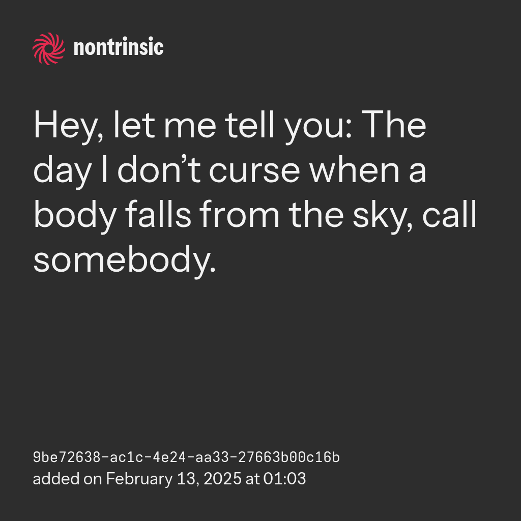 bagikanHey, let me tell you: The day I don’t curse when a body falls from the sky, call somebody.