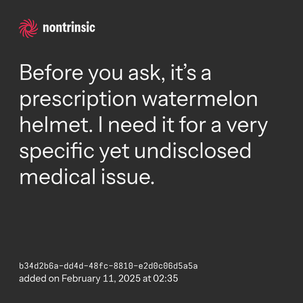 bagikanBefore you ask, it’s a prescription watermelon helmet. I need it for a very specific yet undisclosed medical issue.
