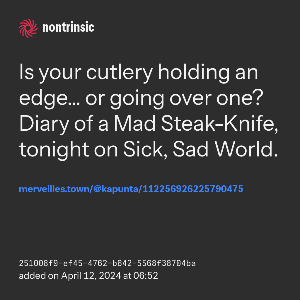bagikanIs your cutlery holding an edge… or going over one? Diary of a Mad Steak-Knife, tonight on Sick, Sad World.