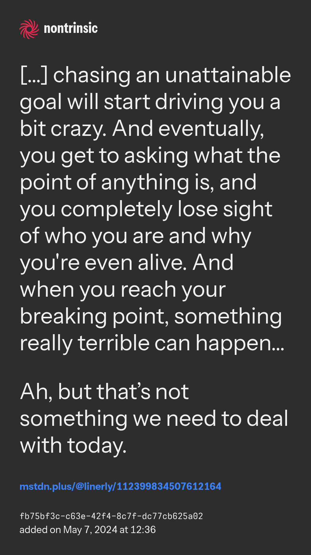 bagikan[…] chasing an unattainable goal will start driving you a bit crazy. And eventually, you get to asking what the point of anything is, and you completely lose sight of who you are and why you're even alive. And when you reach your breaking point, something really terrible can happen…