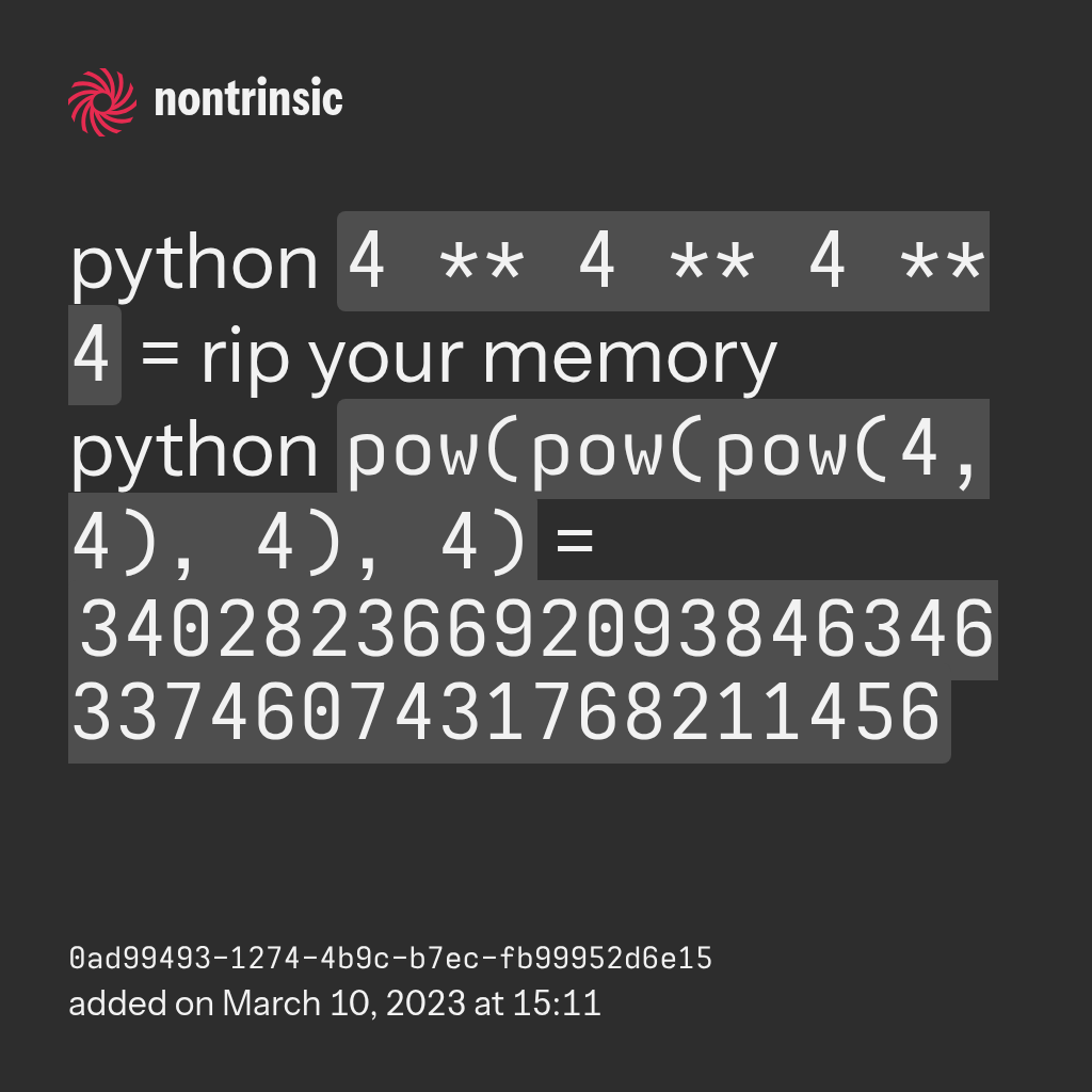 bagikanpython 4 ** 4 ** 4 ** 4 = rip your memory
