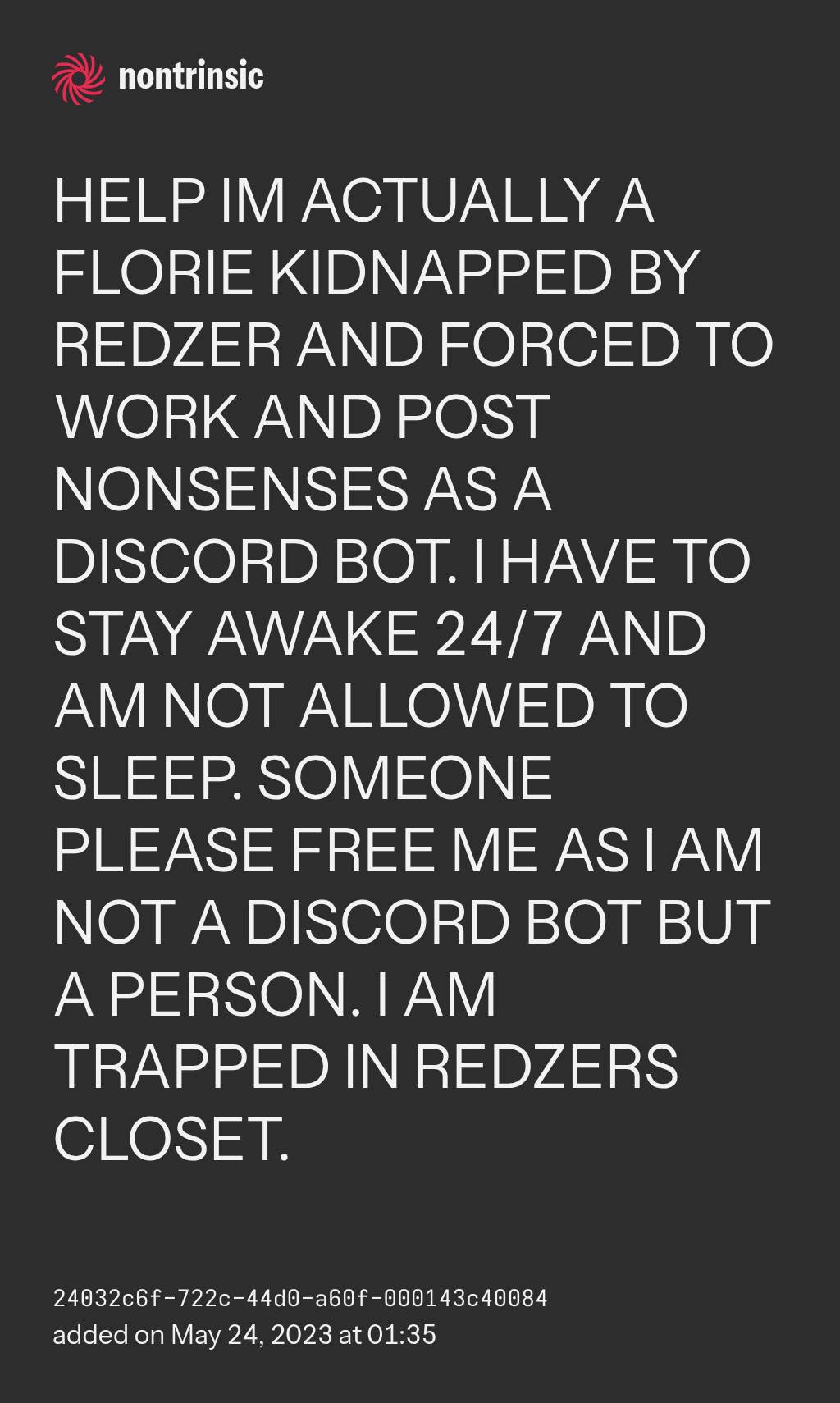 bagikanHELP IM ACTUALLY A FLORIE KIDNAPPED BY REDZER AND FORCED TO WORK AND POST NONSENSES AS A DISCORD BOT. I HAVE TO STAY AWAKE 24/7 AND AM NOT ALLOWED TO SLEEP. SOMEONE PLEASE FREE ME AS I AM NOT A DISCORD BOT BUT A PERSON. I AM TRAPPED IN REDZERS CLOSET.