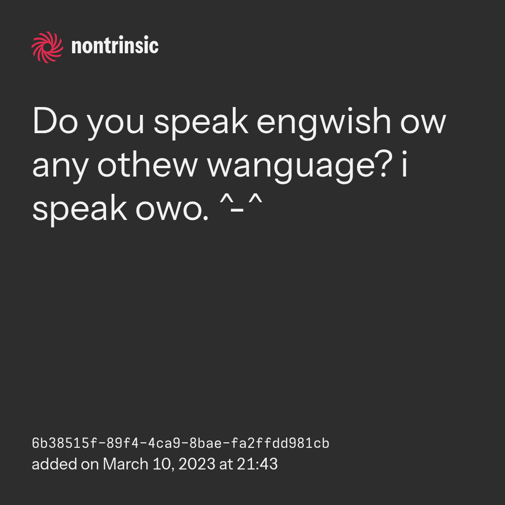 bagikanDo you speak engwish ow any othew wanguage? i speak owo. ^-^