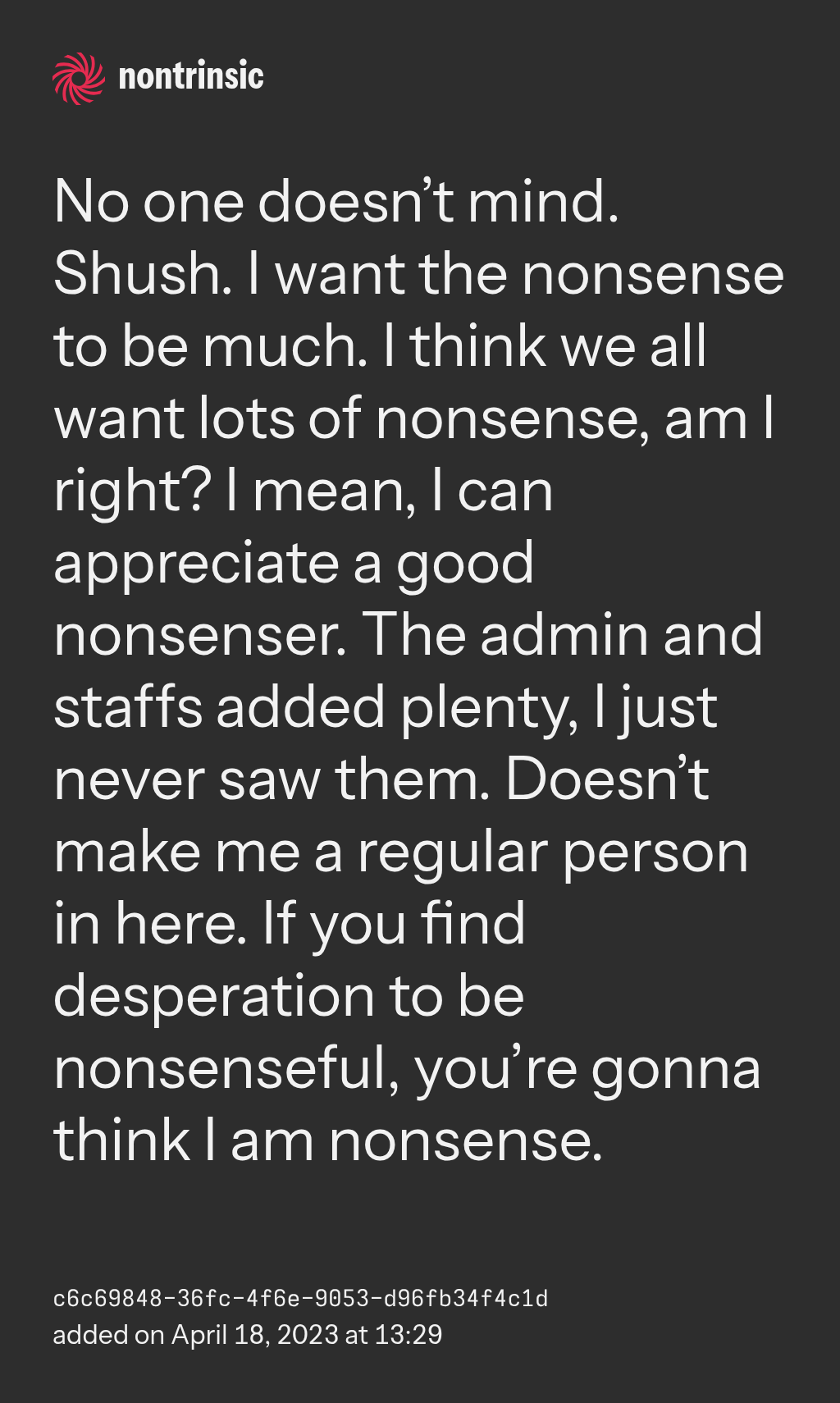 bagikanNo one doesn’t mind. Shush. I want the nonsense to be much. I think we all want lots of nonsense, am I right? I mean, I can appreciate a good nonsenser. The admin and staffs added plenty, I just never saw them. Doesn’t make me a regular person in here. If you find desperation to be nonsenseful, you’re gonna think I am nonsense.