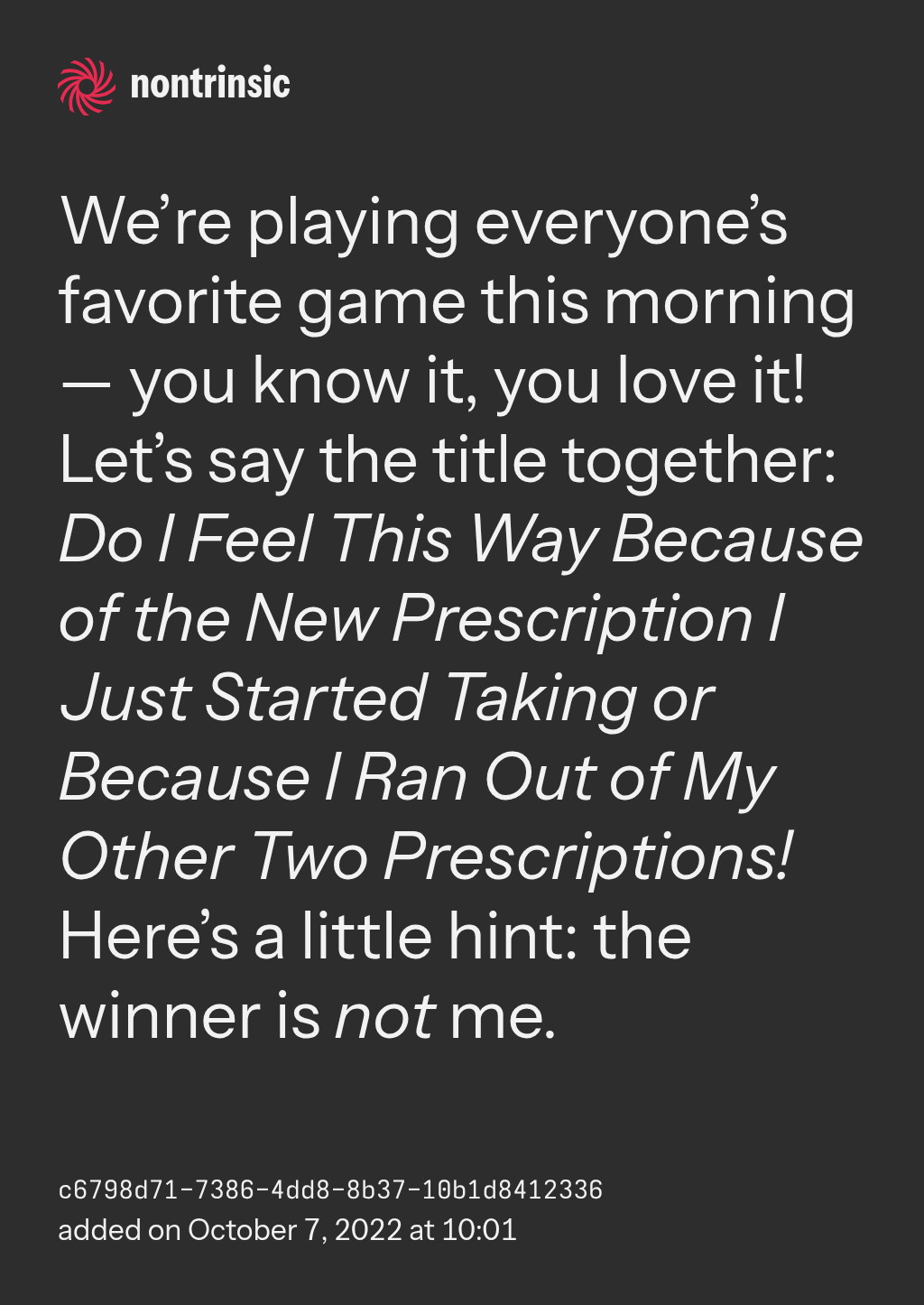 Let’s say the title together: Do I Feel This Way Because of the New Prescription I Just Started Taking or Because I Ran Out of My Other Two Prescriptions!