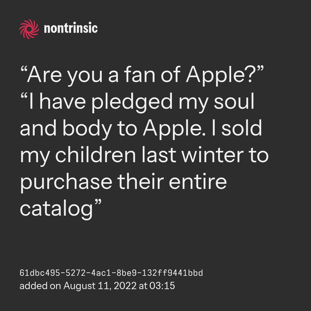 “I have pledged my soul and body to Apple. I sold my children last winter to purchase their entire catalog”