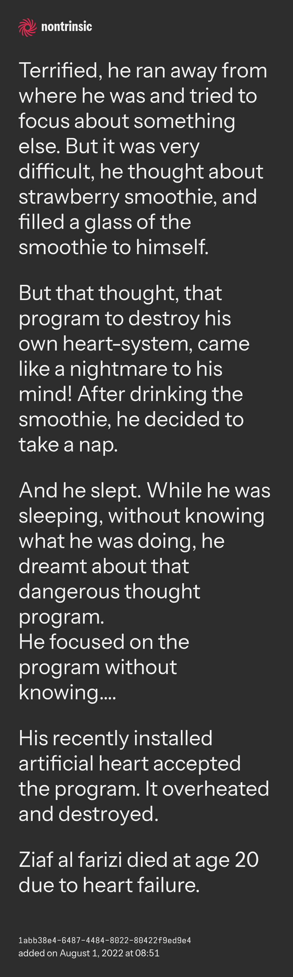 But that thought, that program to destroy his own heart-system, came like a nightmare to his mind! After drinking the smoothie, he decided to take a nap.