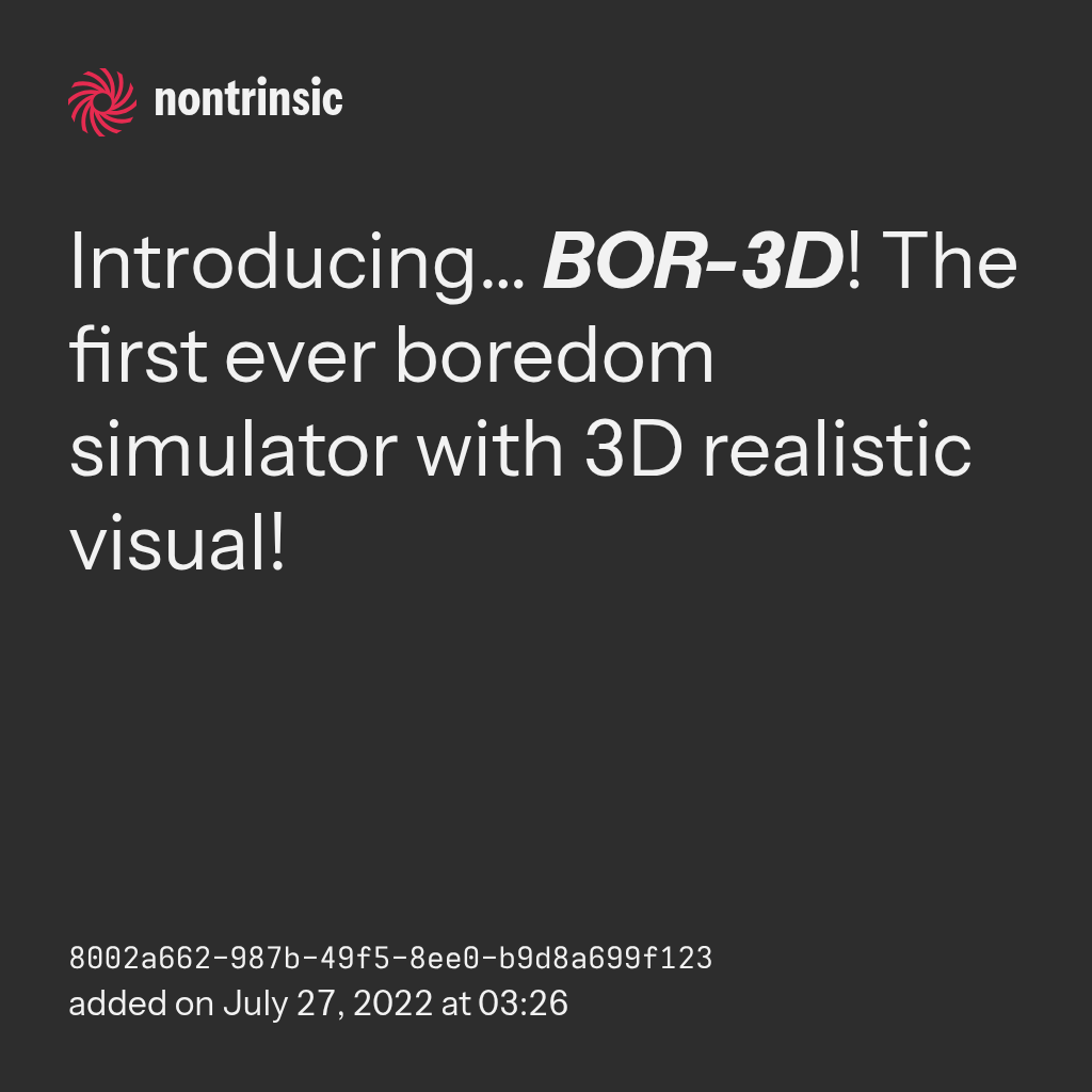 bagikanIntroducing… BOR-3D! The first ever boredom simulator with 3D realistic visual!