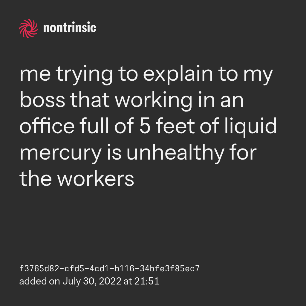 bagikanme trying to explain to my boss that working in an office full of 5 feet of liquid mercury is unhealthy for the workers