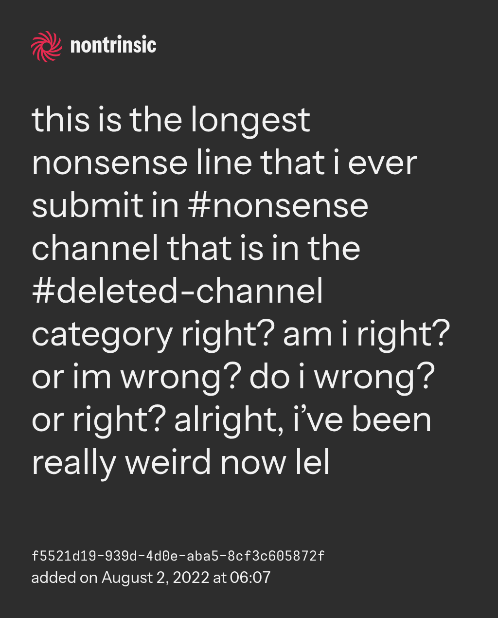 bagikanthis is the longest nonsense line that i ever submit in #nonsense channel that is in the #deleted-channel category right? am i right? or im wrong? do i wrong? or right? alright, i’ve been really weird now lel