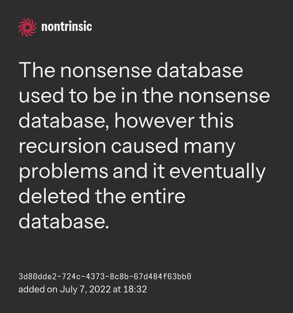 bagikanThe nonsense database used to be in the nonsense database, however this recursion caused many problems and it eventually deleted the entire database.