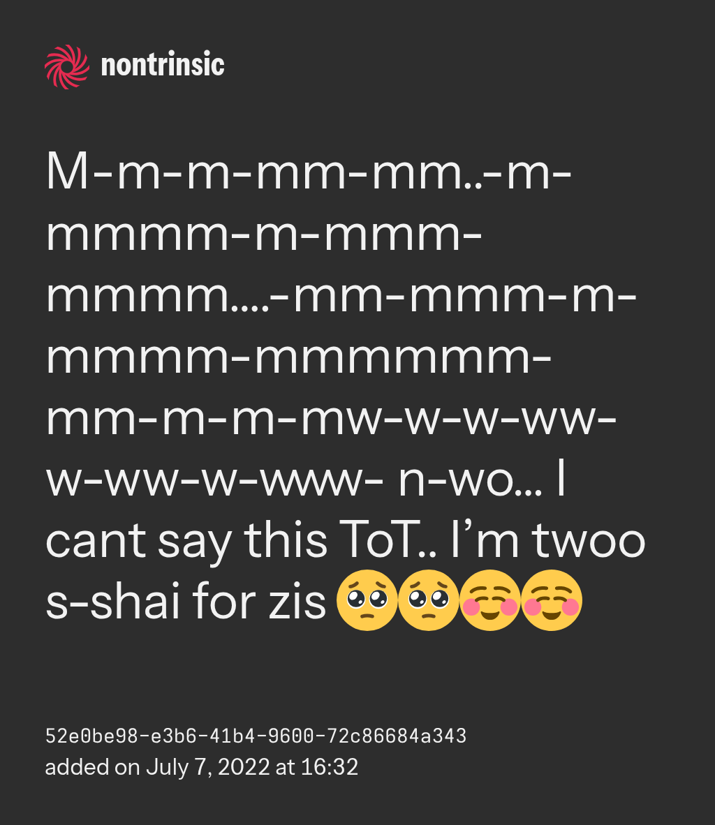bagikanM-m-m-mm-mm..-m-mmmm-m-mmm-mmmmโฆ.-mm-mmm-m-mmmm-mmmmmm-mm-m-m-mw-w-w-ww-w-ww-w-www- n-woโฆ I cant say this ToT.. Iโm twoo s-shai for zis ๐ฅบ๐ฅบโบ๏ธโบ๏ธ