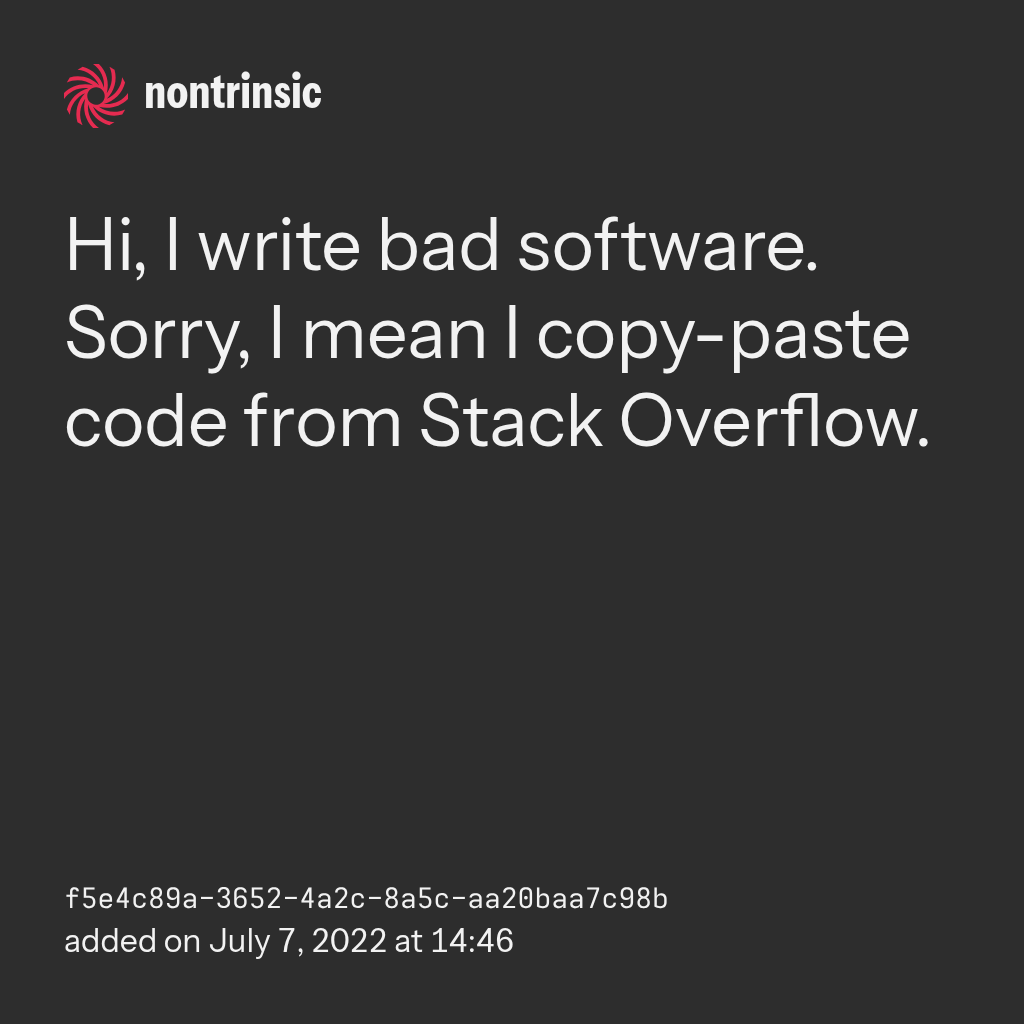 bagikanHi, I write bad software. Sorry, I mean I copy-paste code from Stack Overflow.