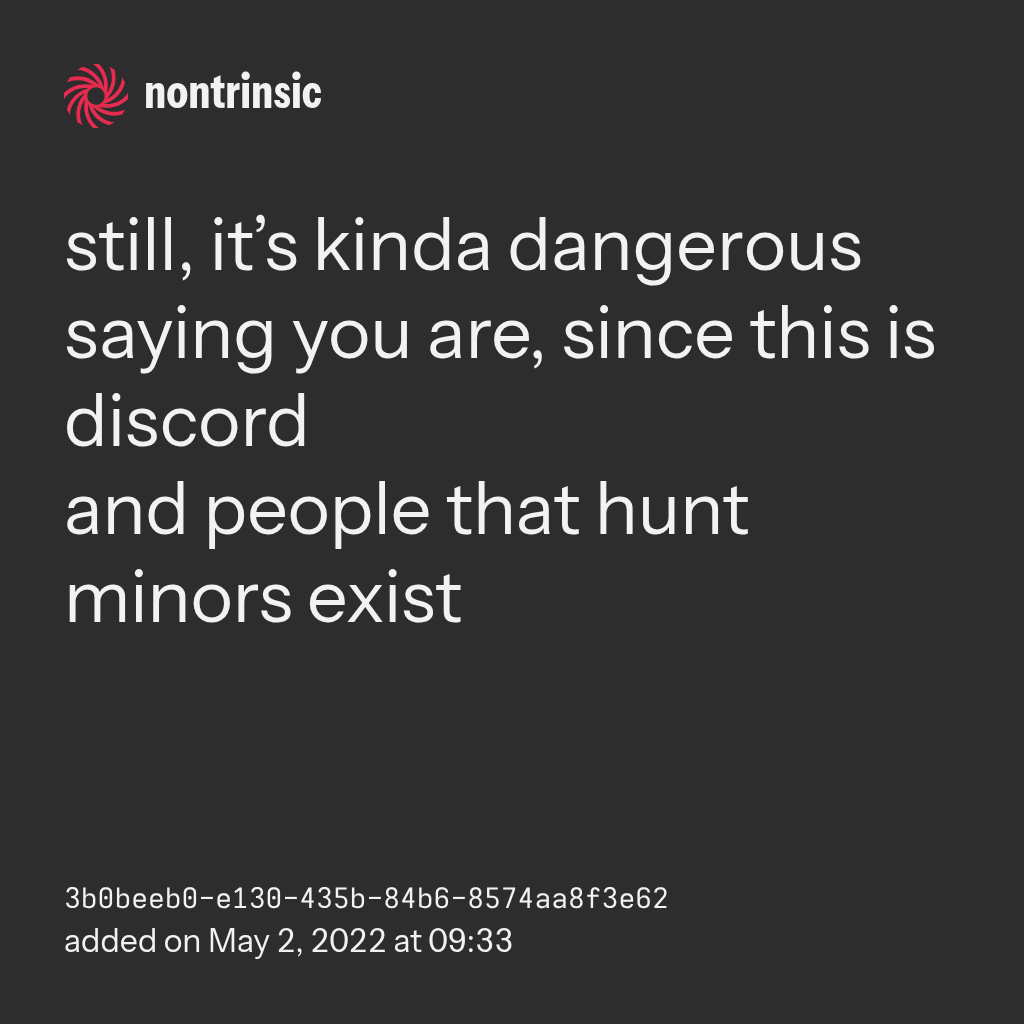 bagikanstill, it’s kinda dangerous saying you are, since this is discord