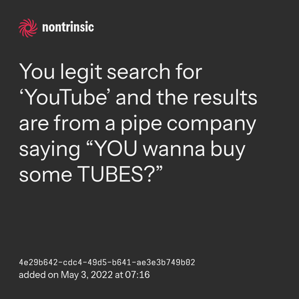 bagikanYou legit search for ‘YouTube’ and the results are from a pipe company saying “YOU wanna buy some TUBES?”