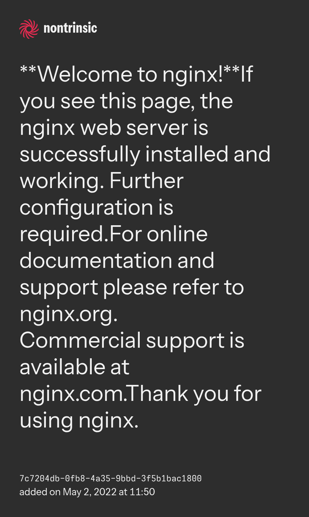 Commercial support is available at nginx.com.Thank you for using nginx.
