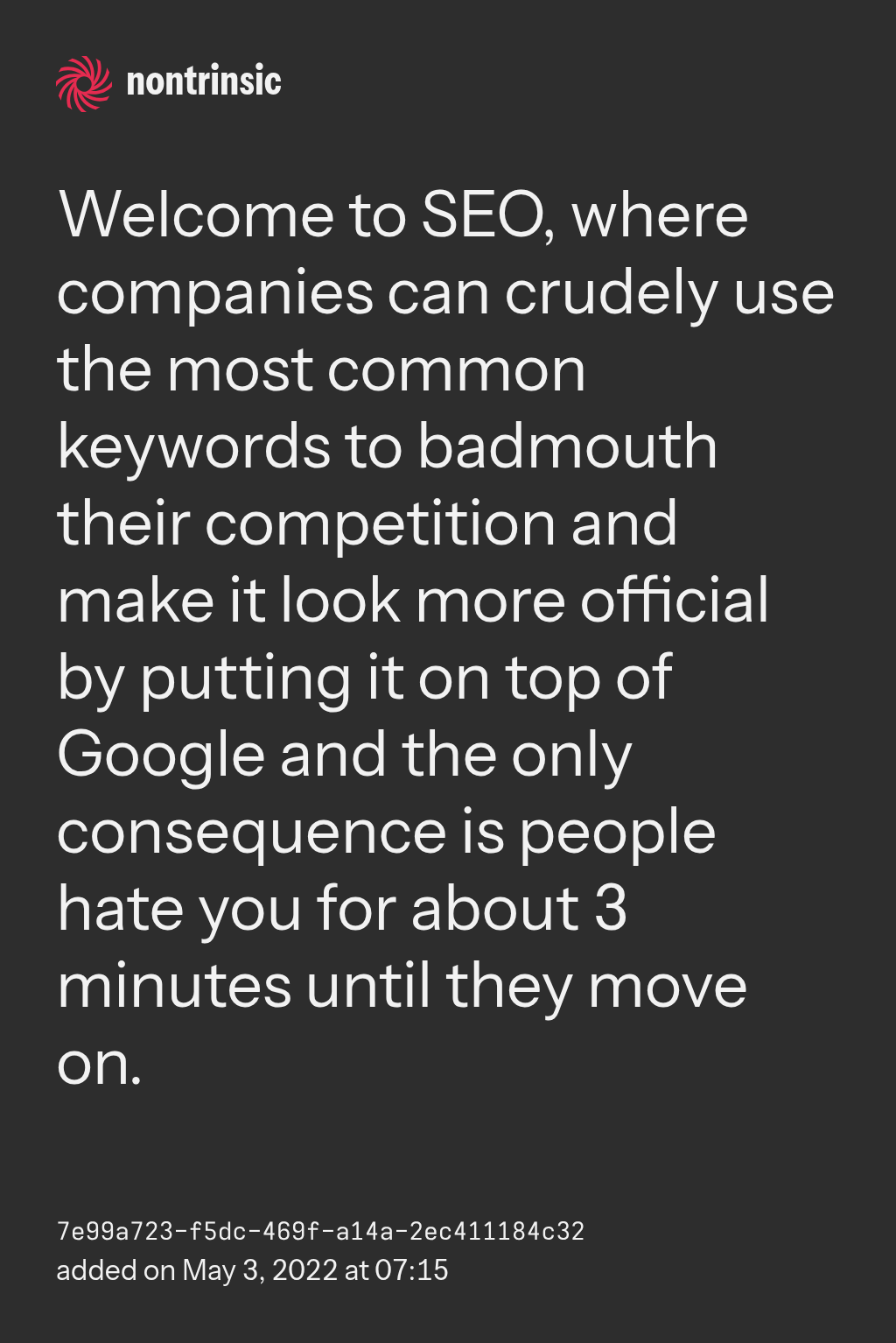 bagikanWelcome to SEO, where companies can crudely use the most common keywords to badmouth their competition and make it look more official by putting it on top of Google and the only consequence is people hate you for about 3 minutes until they move on.