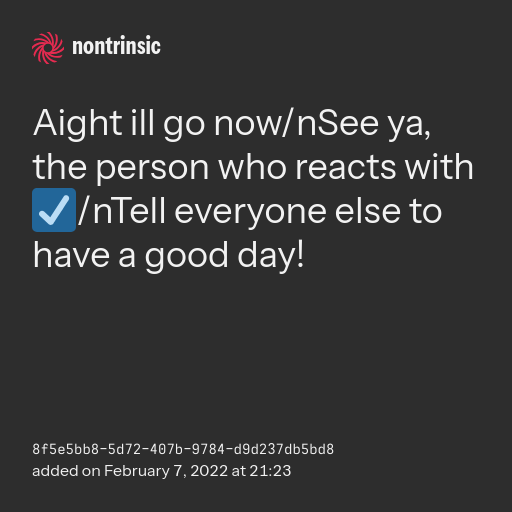 bagikanAight ill go now/nSee ya, the person who reacts with ☑️/nTell everyone else to have a good day!