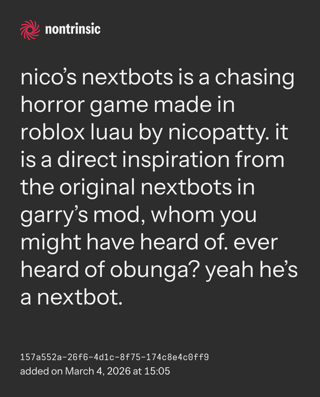 bagikannico’s nextbots is a chasing horror game made in roblox luau by nicopatty. it is a direct inspiration from the original nextbots in garry’s mod, whom you might have heard of. ever heard of obunga? yeah he’s a nextbot.
