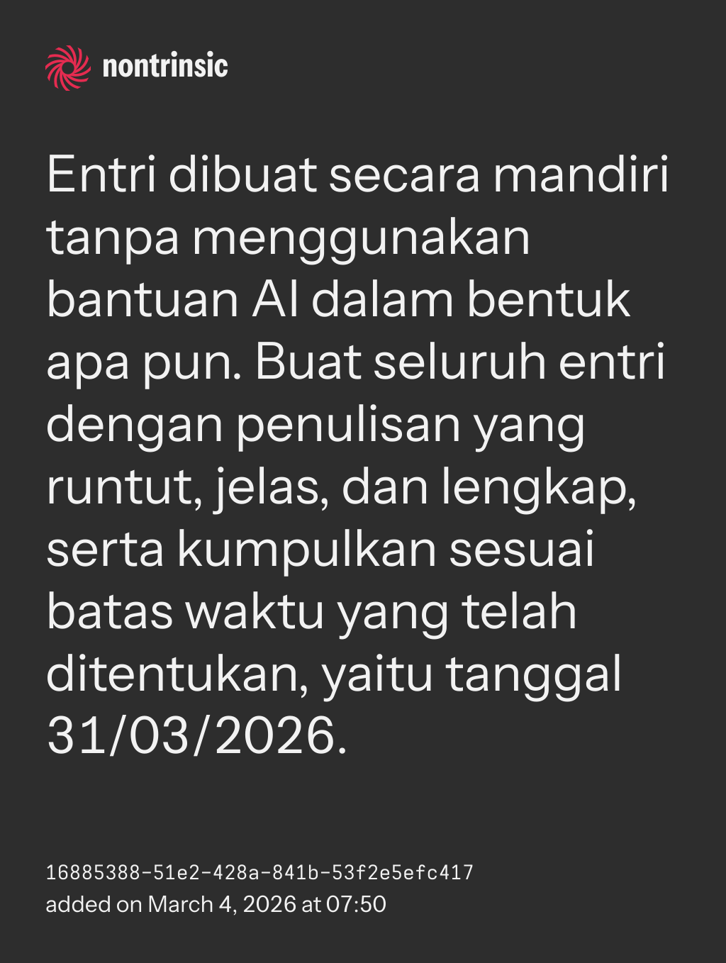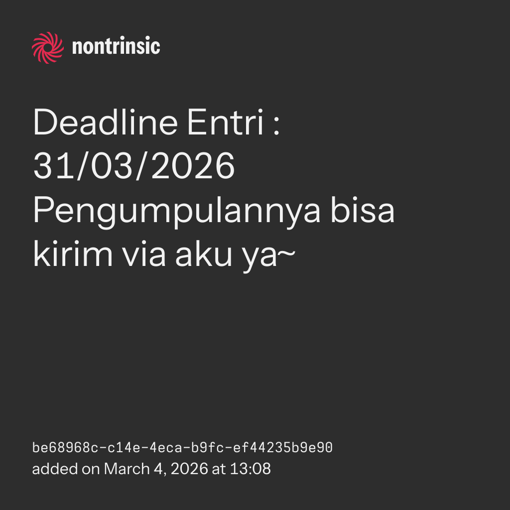 bagikanEntri dibuat secara mandiri tanpa menggunakan bantuan AI dalam bentuk apa pun. Buat seluruh entri dengan penulisan yang runtut, jelas, dan lengkap, serta kumpulkan sesuai batas waktu yang telah ditentukan, yaitu tanggal 31/03/2026.