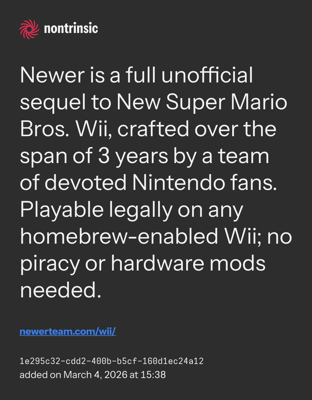 bagikanNewer is a full unofficial sequel to New Super Mario Bros. Wii, crafted over the span of 3 years by a team of devoted Nintendo fans. Playable legally on any homebrew-enabled Wii; no piracy or hardware mods needed.