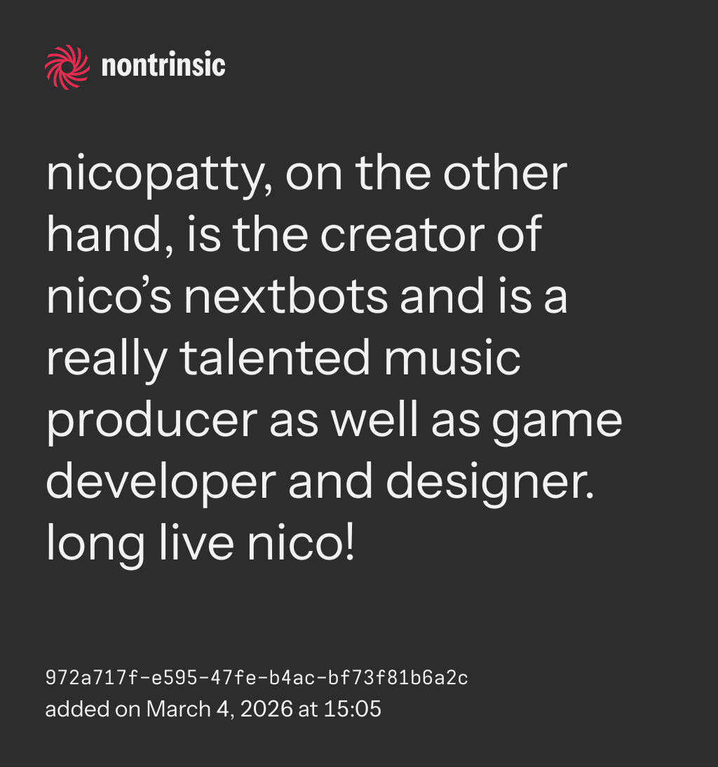 bagikannicopatty, on the other hand, is the creator of nico’s nextbots and is a really talented music producer as well as game developer and designer. long live nico!