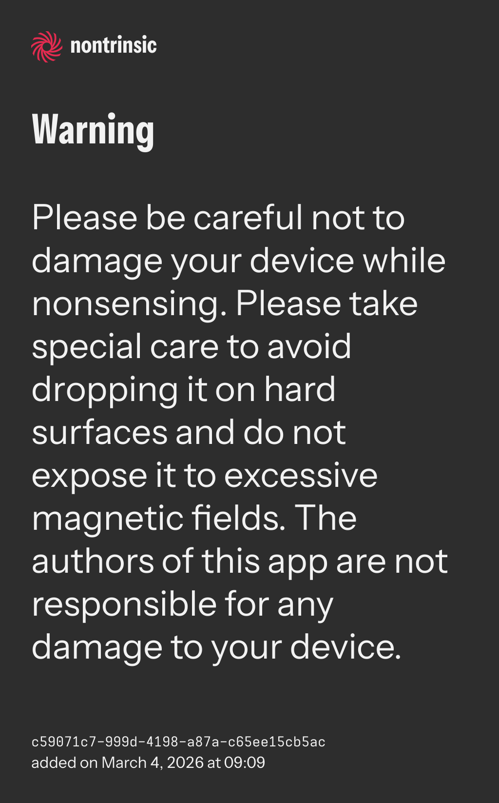 Please be careful not to damage your device while nonsensing. Please take special care to avoid dropping it on hard surfaces and do not expose it to excessive magnetic fields. The authors of this app are not responsible for any damage to your device.
