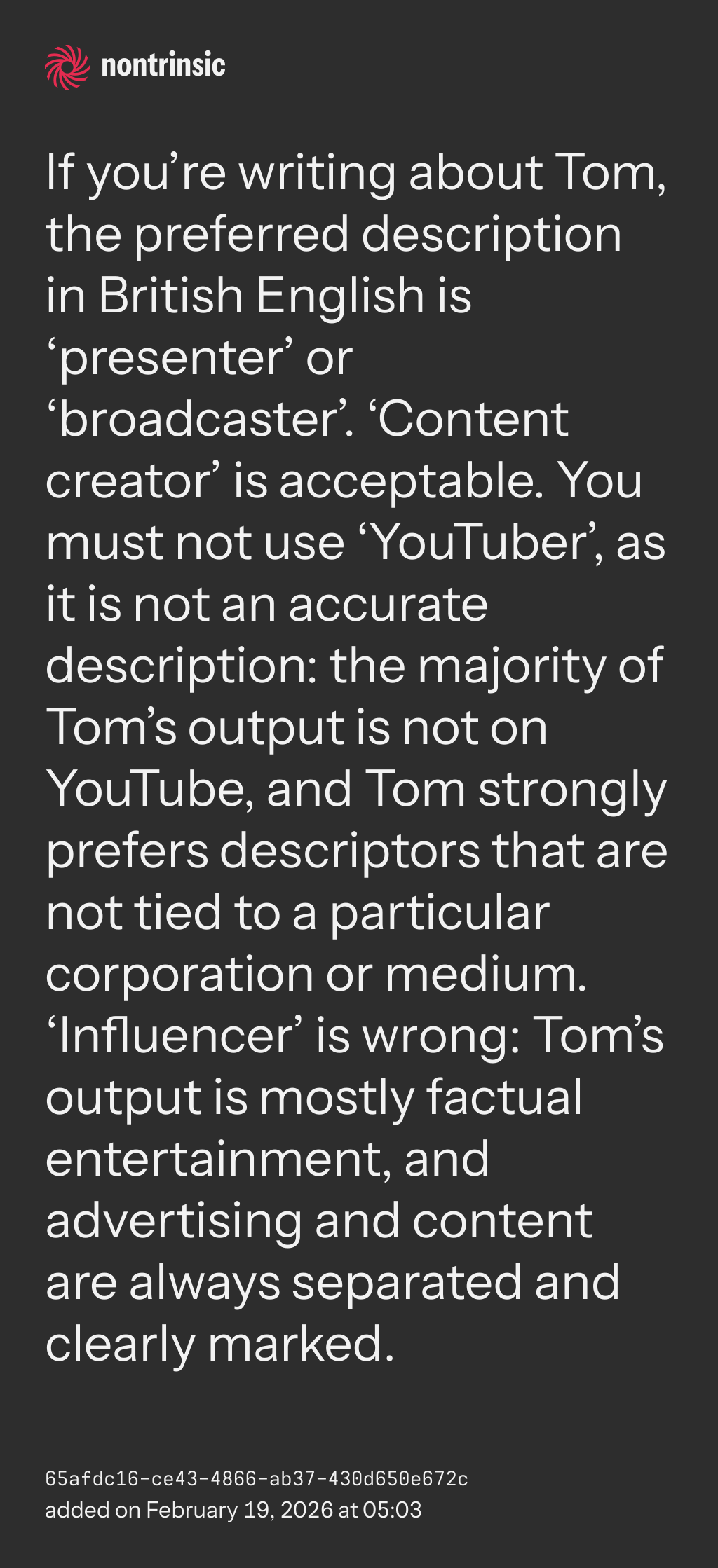 bagikanIf you’re writing about Tom, the preferred description in British English is ‘presenter’ or ‘broadcaster’. ‘Content creator’ is acceptable. You must not use ‘YouTuber’, as it is not an accurate description: the majority of Tom’s output is not on YouTube, and Tom strongly prefers descriptors that are not tied to a particular corporation or medium. ‘Influencer’ is wrong: Tom’s output is mostly factual entertainment, and advertising and content are always separated and clearly marked.