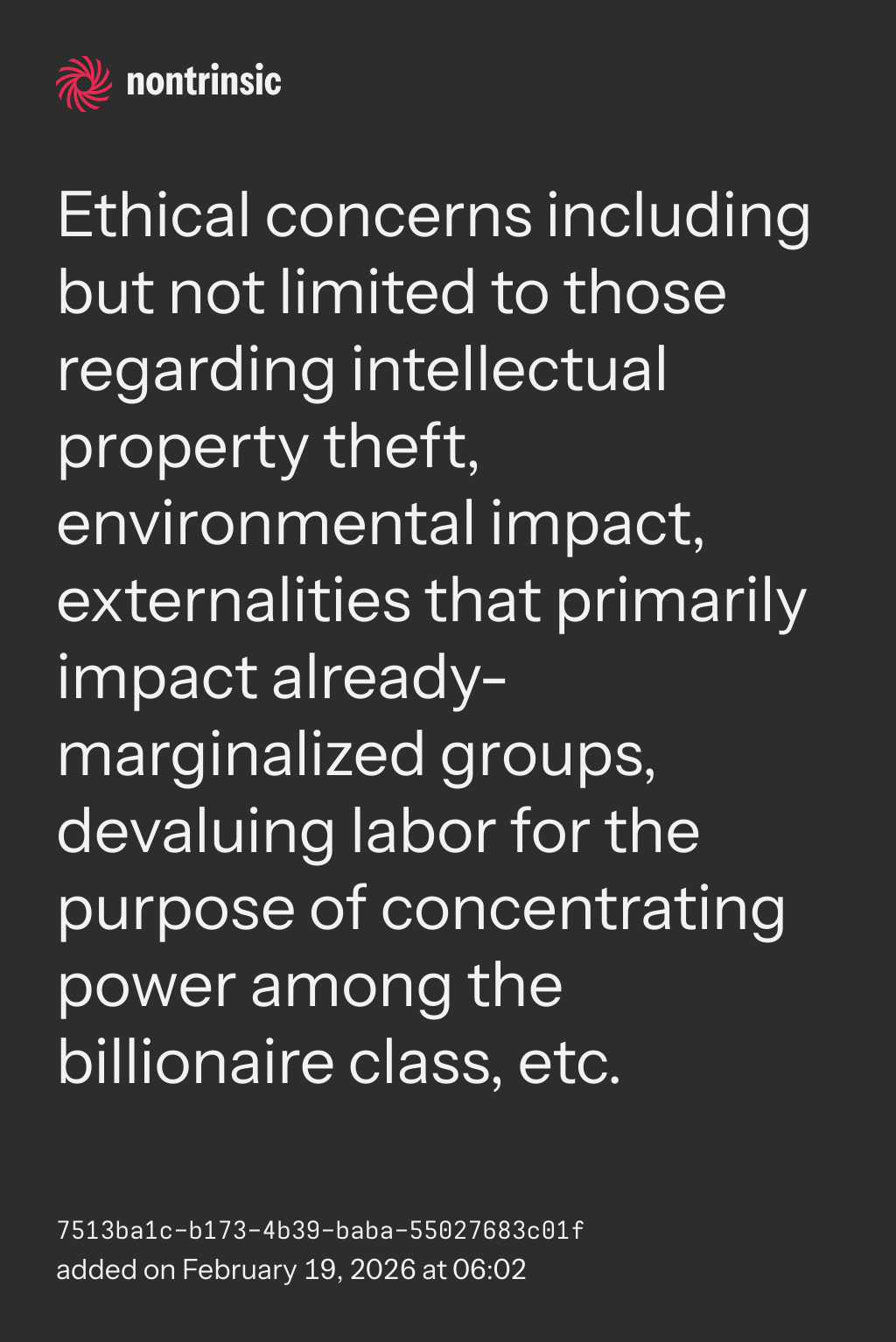 bagikanEthical concerns including but not limited to those regarding intellectual property theft, environmental impact, externalities that primarily impact already-marginalized groups, devaluing labor for the purpose of concentrating power among the billionaire class, etc.