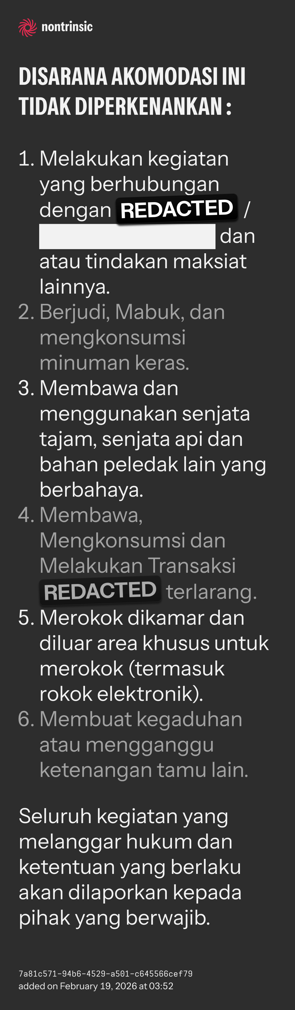 - Membawa, Mengkonsumsi dan Melakukan Transaksi REDACTED terlarang.