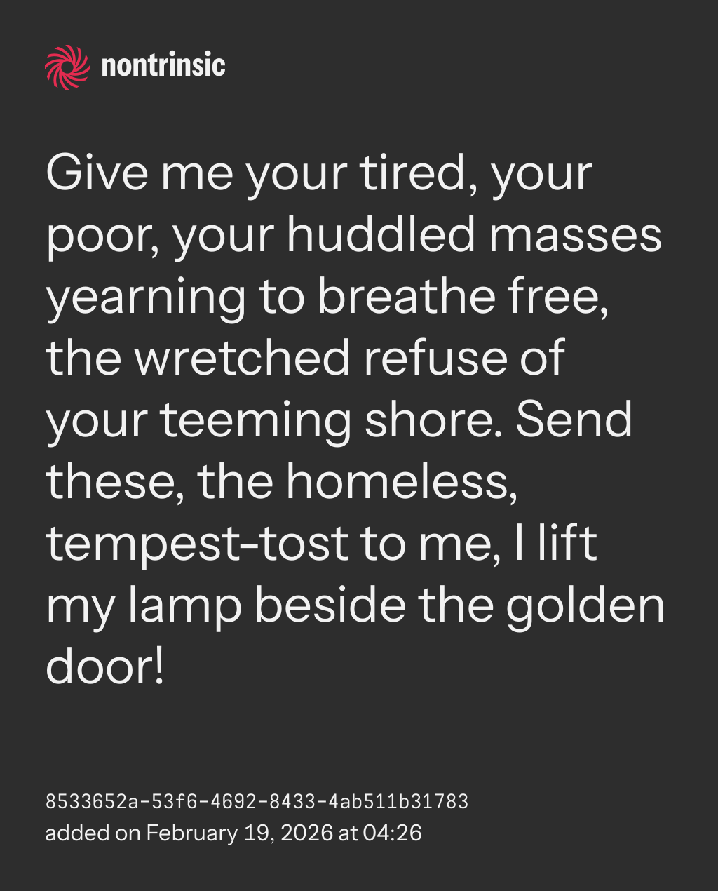bagikanGive me your tired, your poor, your huddled masses yearning to breathe free, the wretched refuse of your teeming shore. Send these, the homeless, tempest-tost to me, I lift my lamp beside the golden door!
