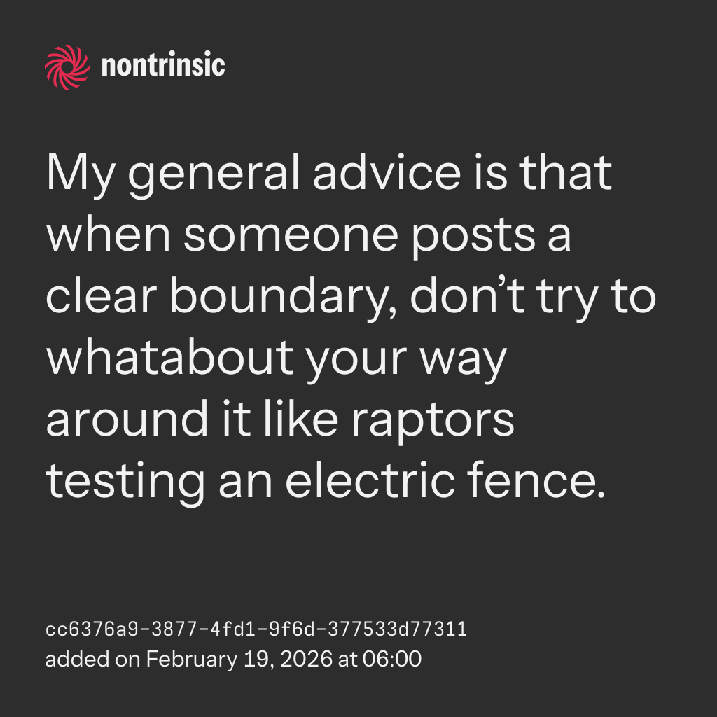 bagikanMy general advice is that when someone posts a clear boundary, don’t try to whatabout your way around it like raptors testing an electric fence.