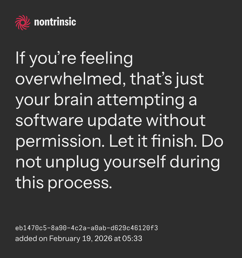 bagikanIf you’re feeling overwhelmed, that’s just your brain attempting a software update without permission. Let it finish. Do not unplug yourself during this process.