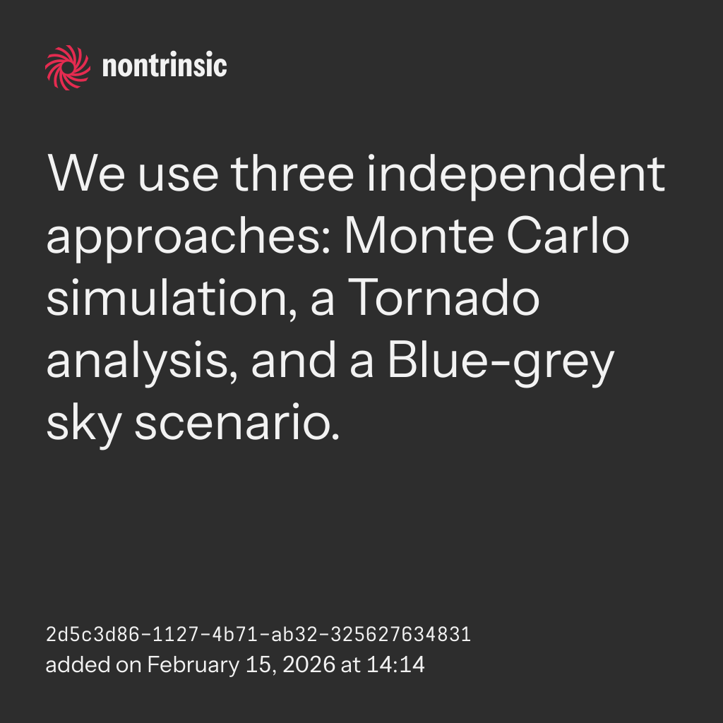 bagikanWe use three independent approaches: Monte Carlo simulation, a Tornado analysis, and a Blue-grey sky scenario.