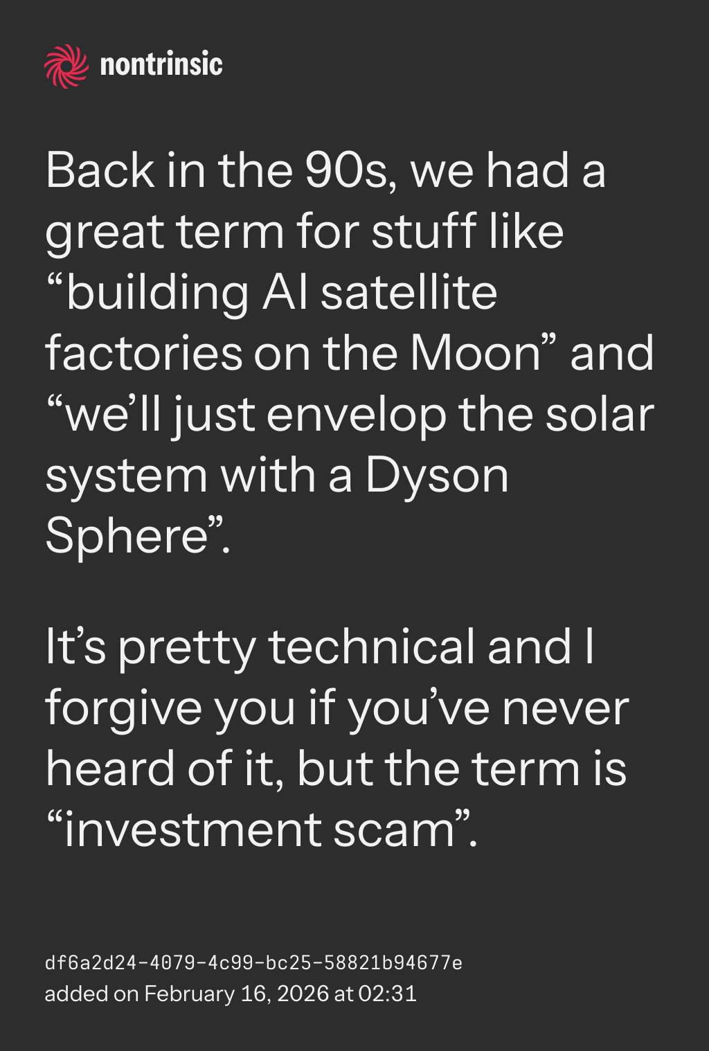 bagikanBack in the 90s, we had a great term for stuff like “building AI satellite factories on the Moon” and “we’ll just envelop the solar system with a Dyson Sphere”.