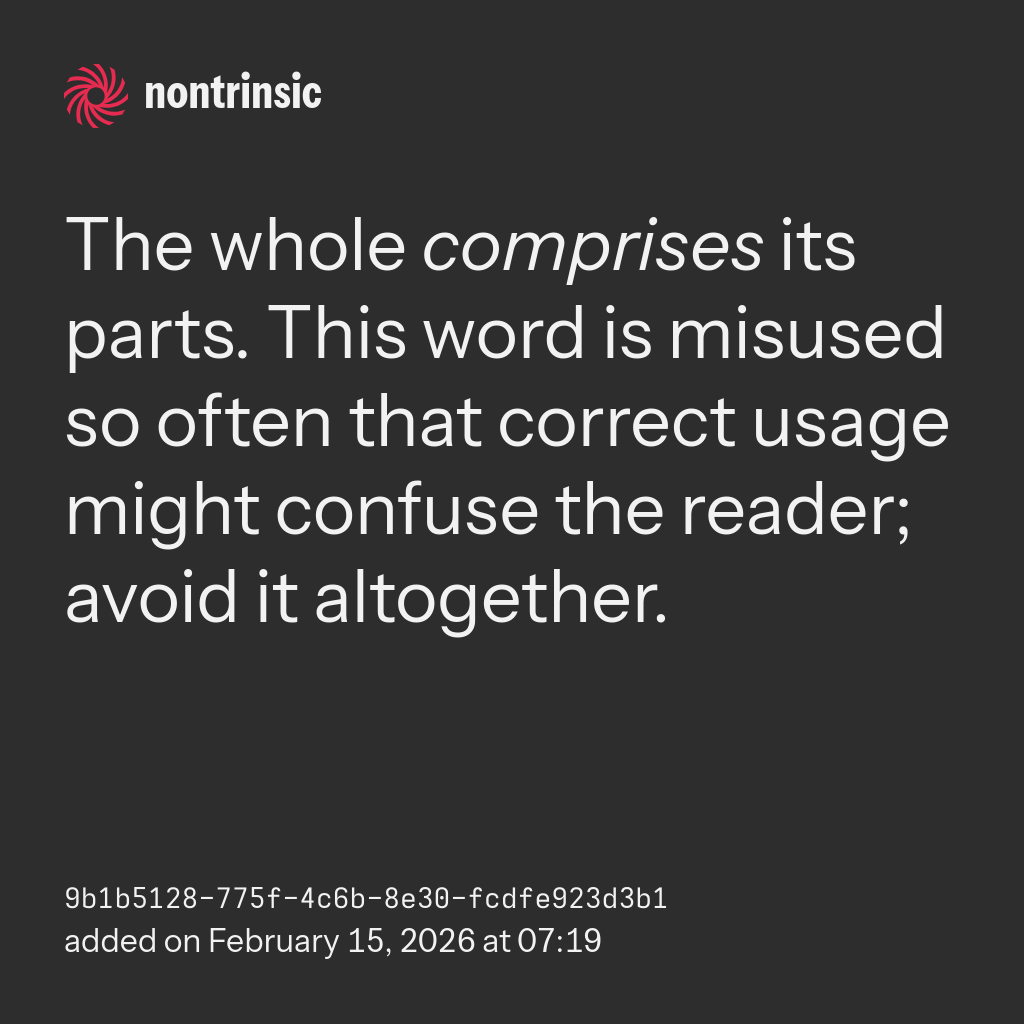 bagikanThe whole comprises its parts. This word is misused so often that correct usage might confuse the reader; avoid it altogether.