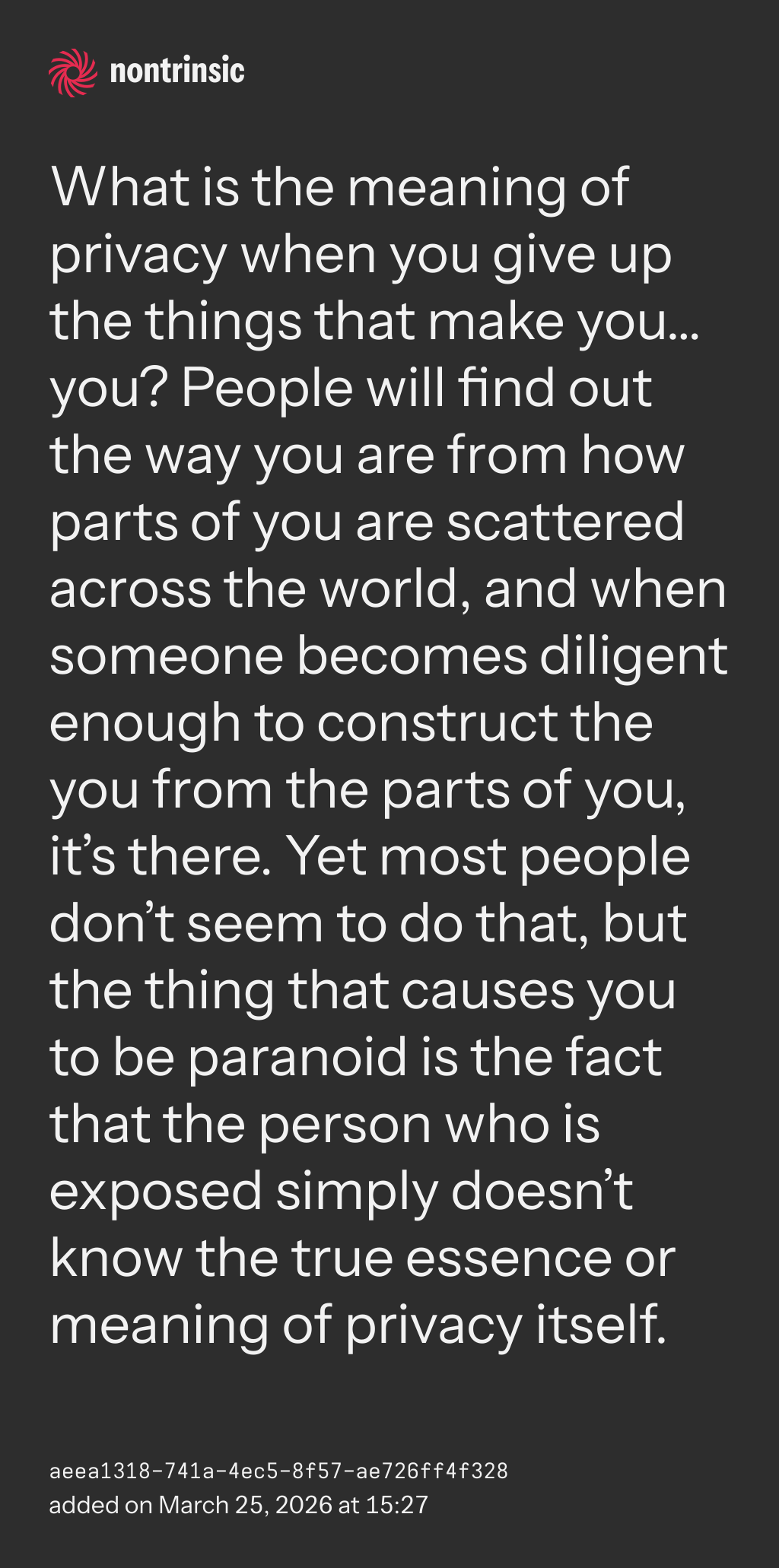 bagikanWhat is the meaning of privacy when you give up the things that make you… you? People will find out the way you are from how parts of you are scattered across the world, and when someone becomes diligent enough to construct the you from the parts of you, it’s there. Yet most people don’t seem to do that, but the thing that causes you to be paranoid is the fact that the person who is exposed simply doesn’t know the true essence or meaning of privacy itself.